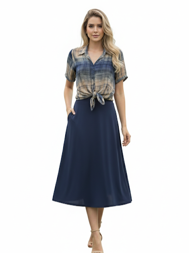 Essa saia é o verdadeiro “tem que ter” do guarda-roupa: fluida, elegante e extremamente versátil. Ela traz aquele movimento que a gente ama com um caimento que valoriza a silhueta de forma impecável.