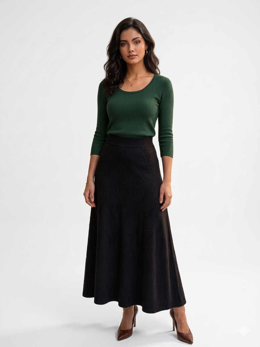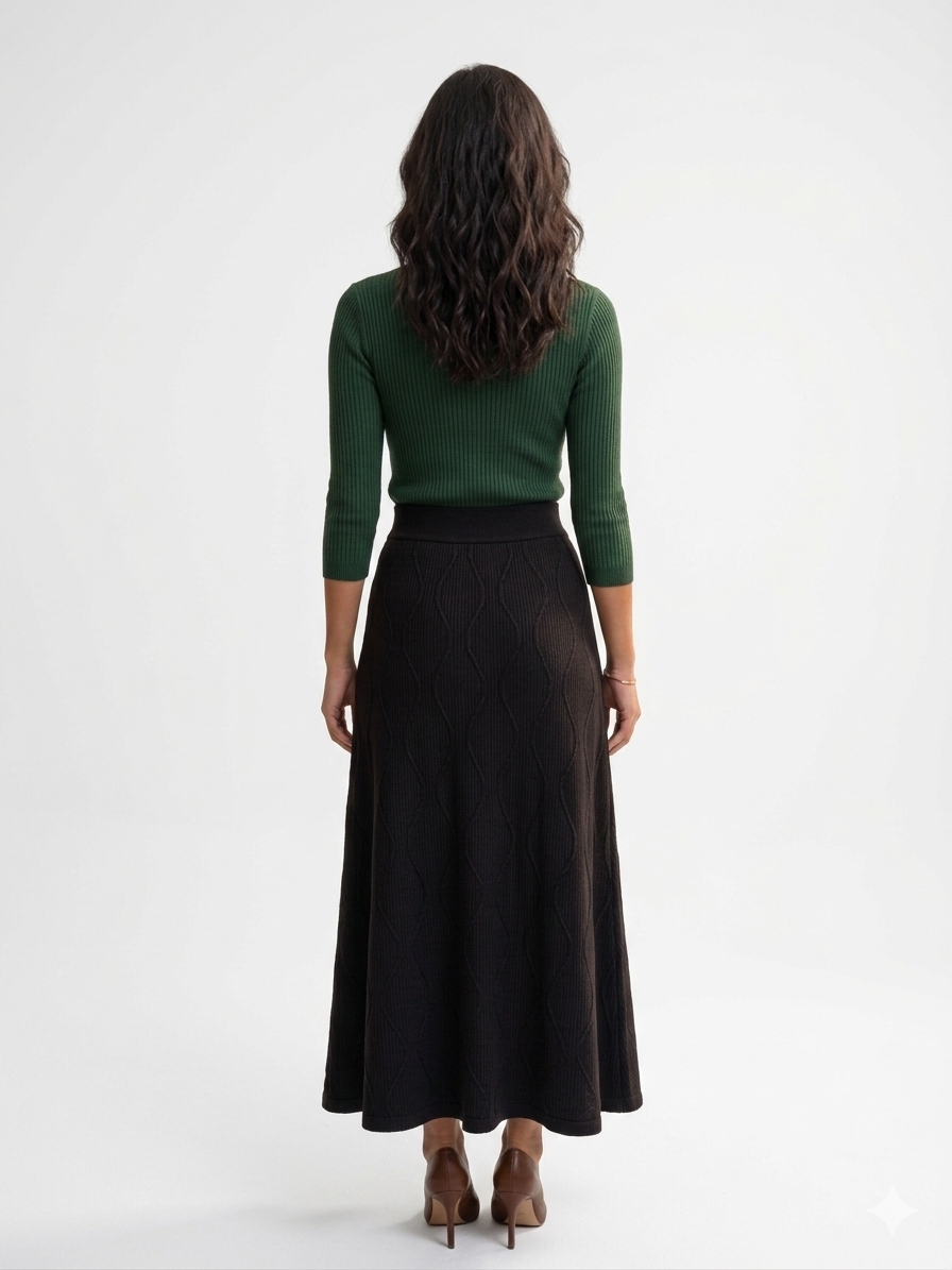 ​O diferencial desta saia fica por conta de sua textura delicada em relevo, que traz profundidade e um toque refinado ao visual. Com um corte que valoriza a silhueta, ela oferece um caimento fluido, perfeito para transitar entre o ambiente de trabalho e eventos sociais com total conforto.