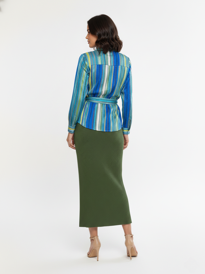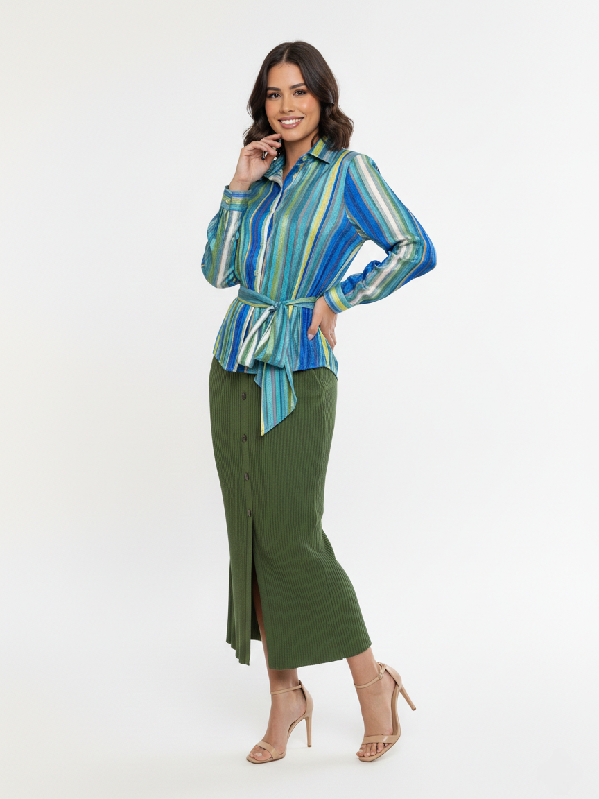 Aposte na versatilidade com nossa saia midi em malha canelada. Com uma modelagem que abraça as curvas de forma confortável, a peça apresenta um fechamento frontal por botões contrastantes e uma fenda estratégica que proporciona leveza e movimento ao caminhar. O tom verde militar é a escolha perfeita para criar looks atemporais, indo do ambiente de trabalho ao lazer com facilidade.