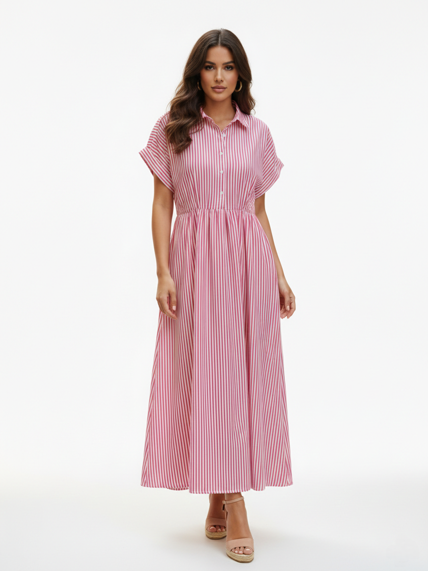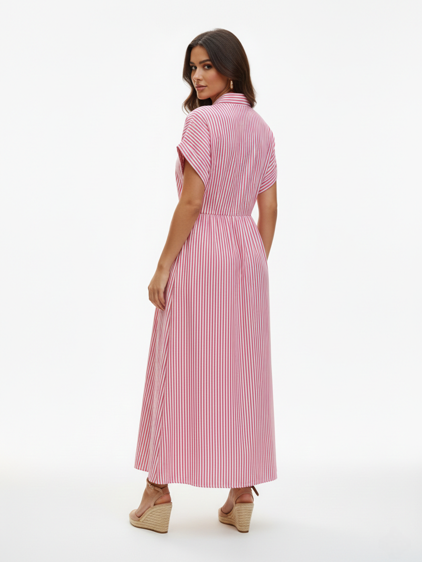 Encante-se com a leveza do vestido com estampa de listras verticais em tom rosa suave. Com uma modelagem clássica estilo “shirt dress”, ele possui fechamento frontal por botões e mangas curtas dobradas que trazem um ar moderno e despojado. A cintura marcada valoriza a silhueta, enquanto a saia fluida garante movimento e frescor para os seus dias de sol.